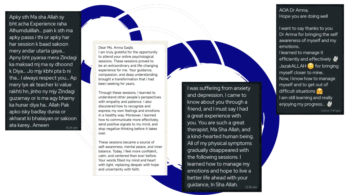 I’m Amna Saqib, a family therapist and emotional healing coach. I’ve helped over 300 people understand their feelings, rebuild their confidence, and fix the patterns that hurt their relationships.
